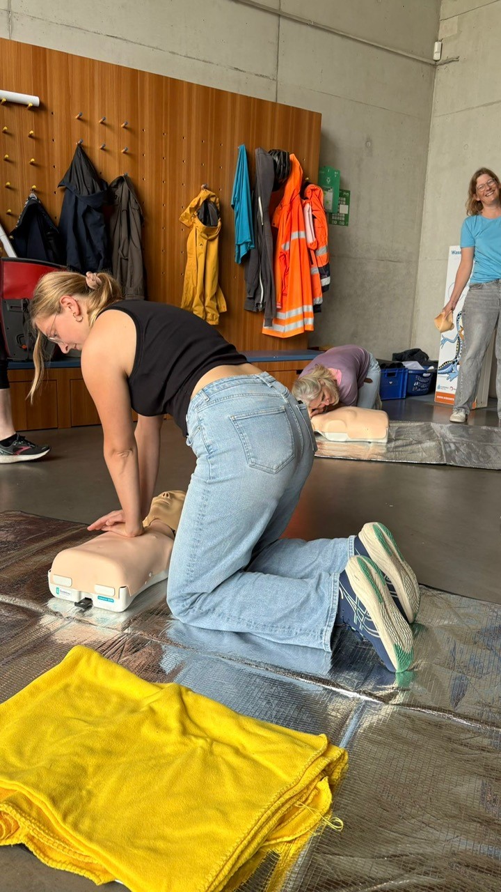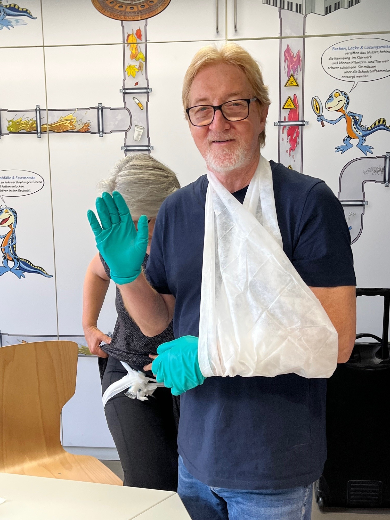 Nicht nur auf dem Klärwerk mit seinen biologischen Gefährdungen und im Wasserwerk gilt es Vorsicht walten zu lassen, auch Stürze auf den Wegen oder andere Notfälle können schlimme Folgen haben. Dann sind die Aufsichtspersonen und die Referent*innen der Wasserschule gefragt. Sie wissen, was in welcher Situation die richtige Hilfe ist und können im Notfall korrekt handeln.